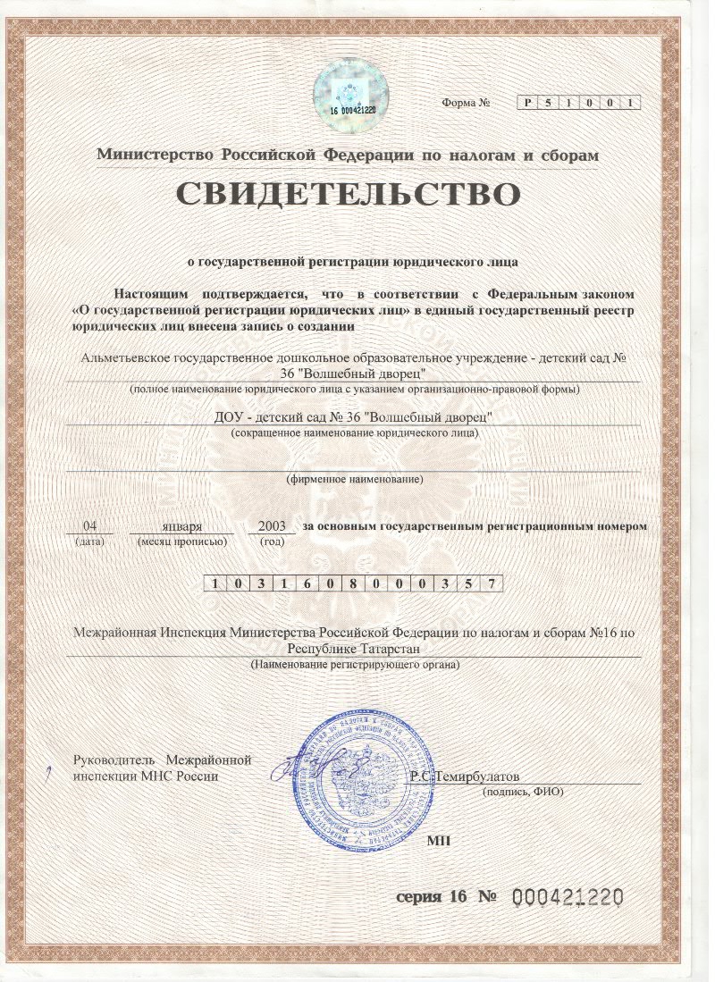 Свидетельство о государственной регистрации юридического лица