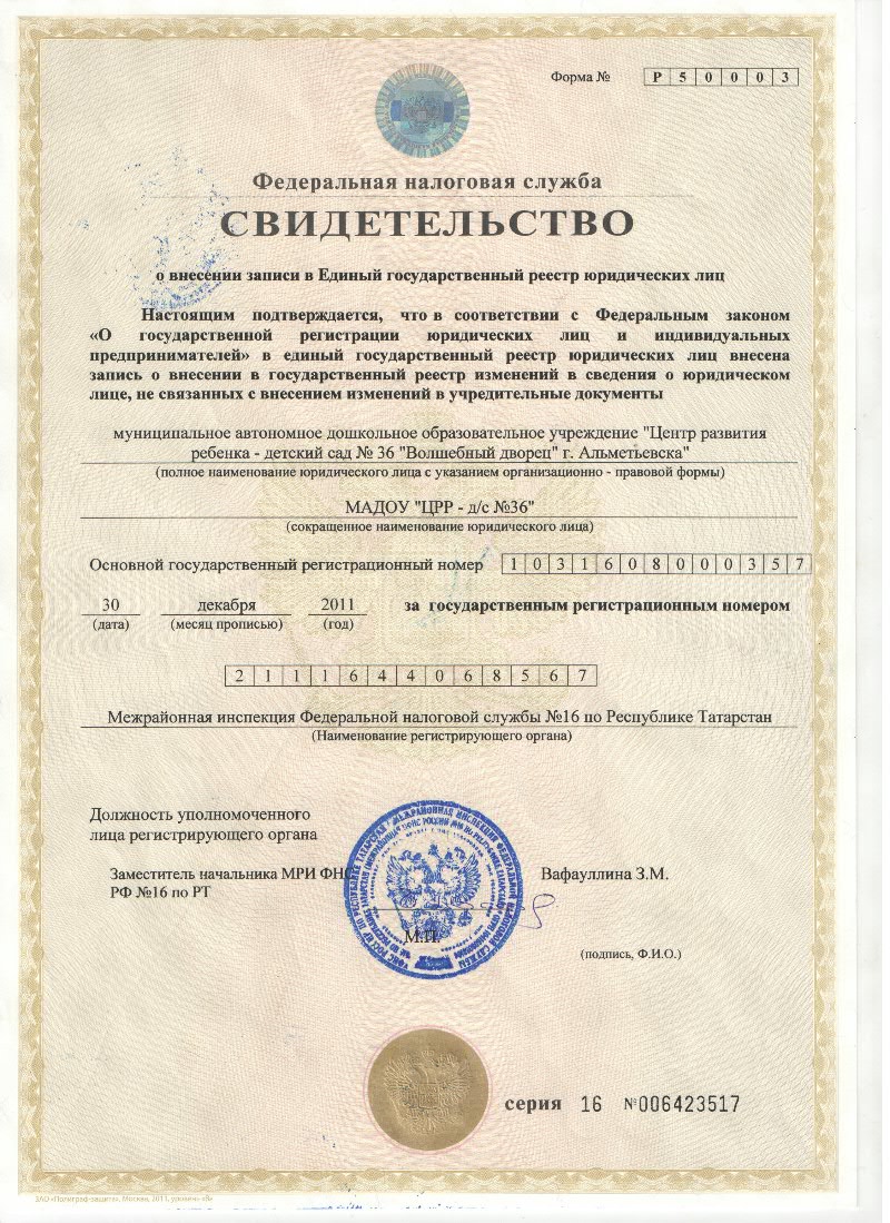 Свидительство о внесении записи в Единый государственный реестр юридического лица (от 30.12.2011г.)