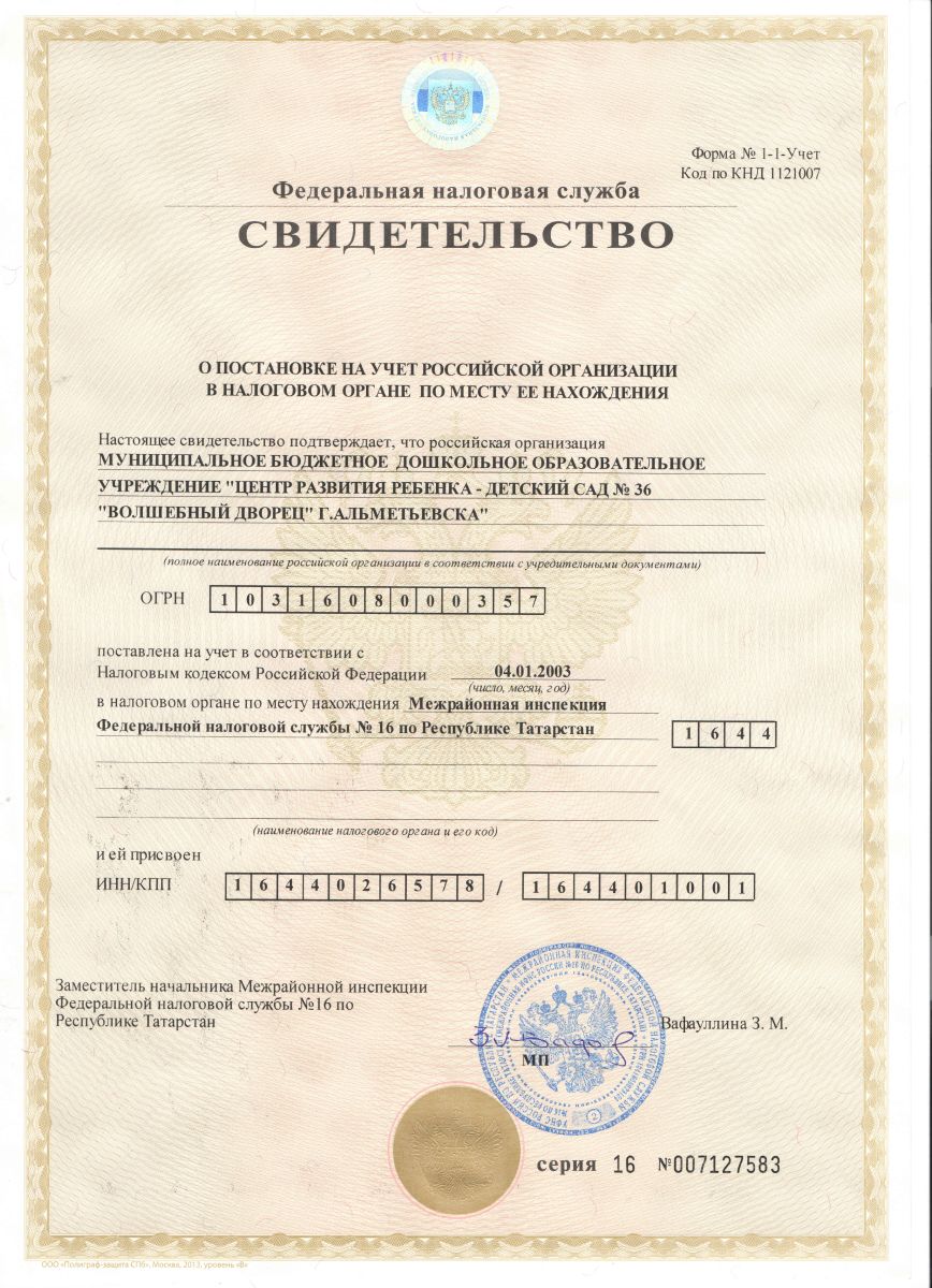 Свидетельство о постановке на учет в налоговом органе