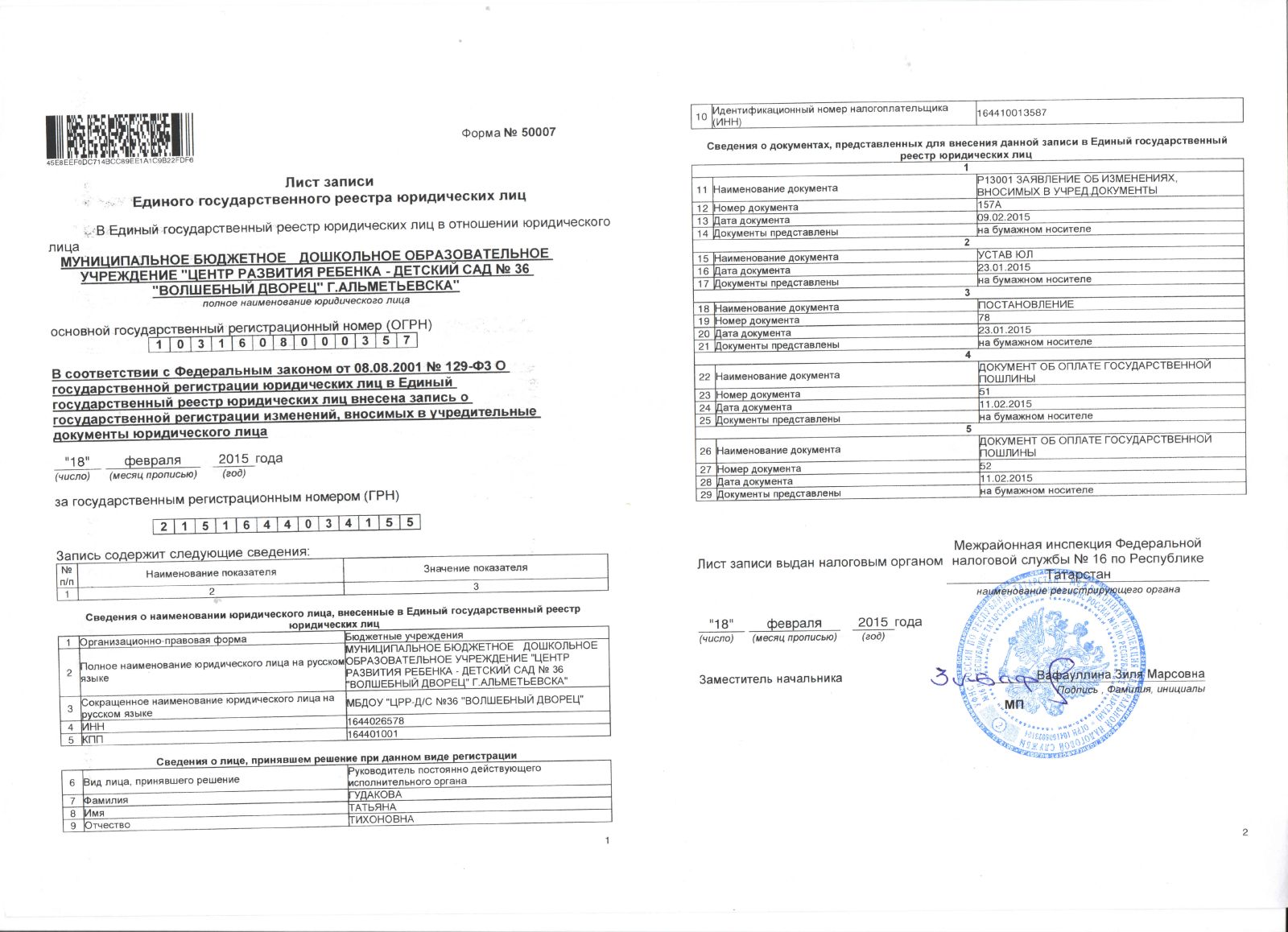 Лист записи Единого государственного реестра юридических лиц (18.02.2015)
