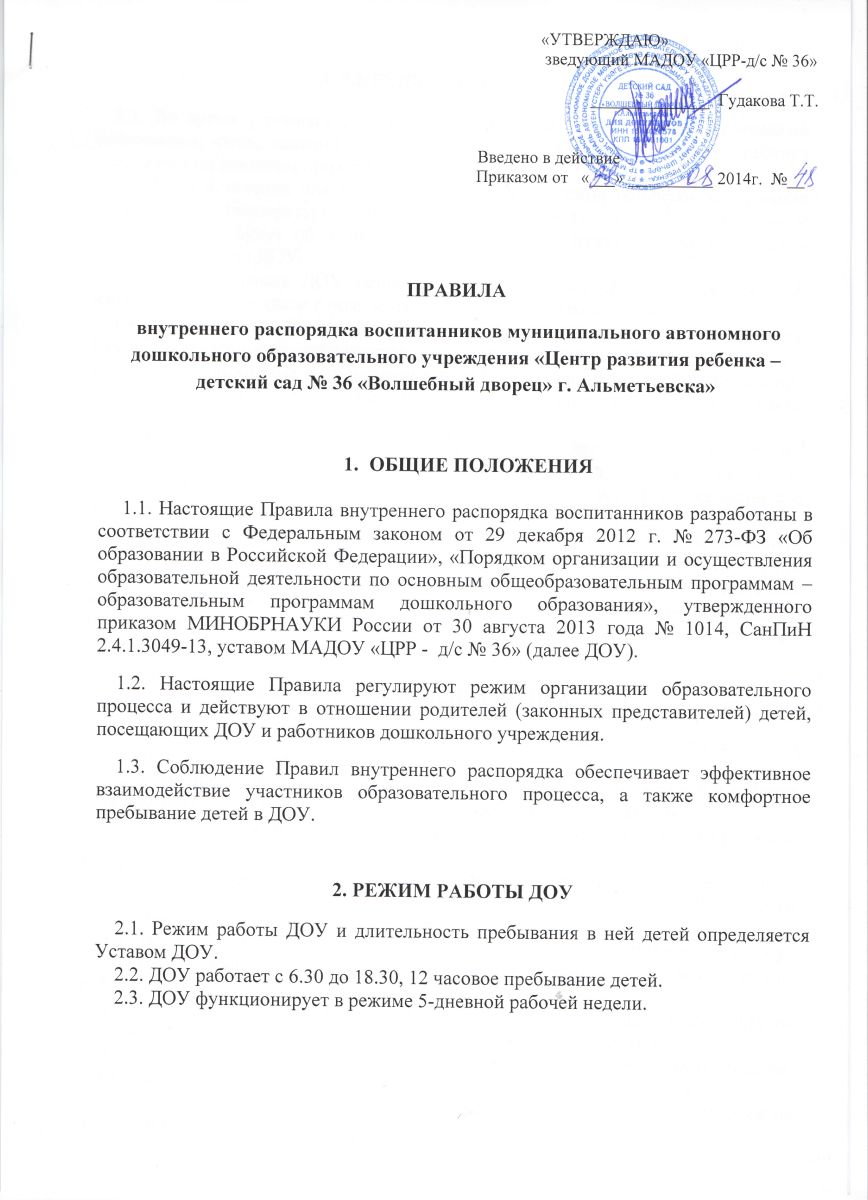 Правила внутреннего распорядка воспитанников МАДОУ "ЦРР-д/с №36"