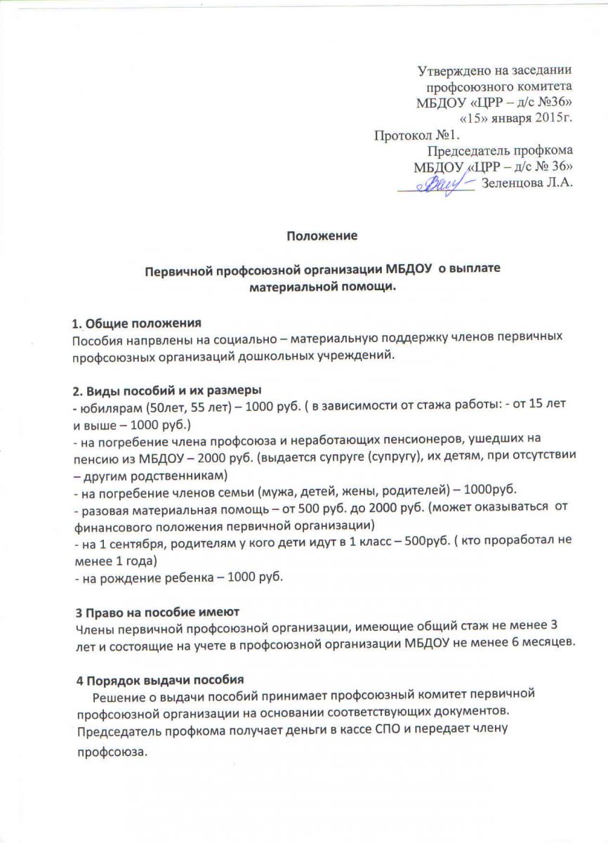 Положение первичной профсоюзной организации МБДОУ о выплате материальной помощи