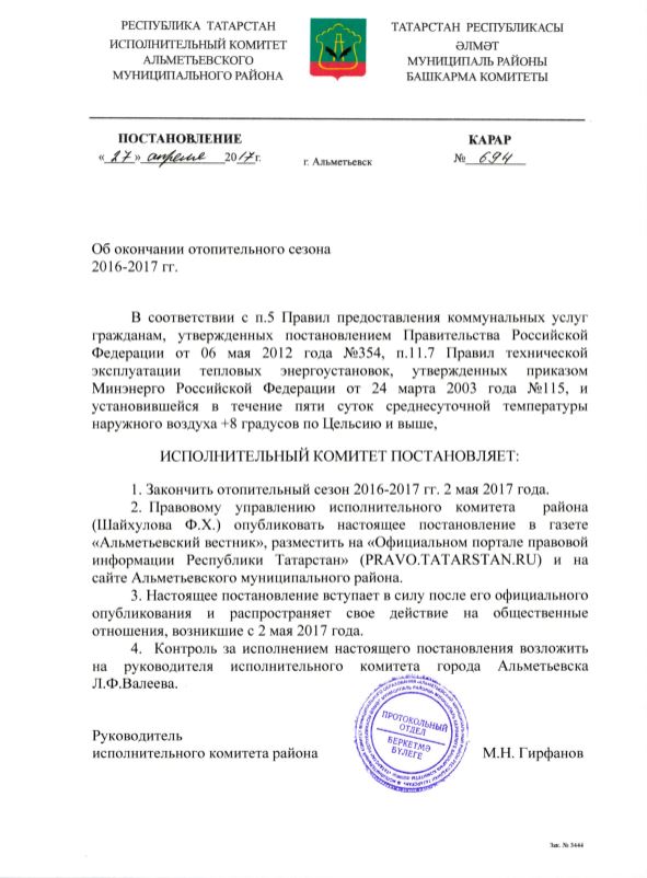 Постановление об окончании отопительного сезона/Ягу сезоны бетү турында карар 27.04.2017