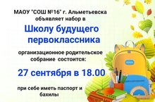 МАОУ «СОШ №16» г. Альметьевска объявляет набор в "Школу будущего первоклассника", проводит организационное родительское собрание: состоится 27 сентября в 18.00 (при себе иметь паспорт и бахилы).
