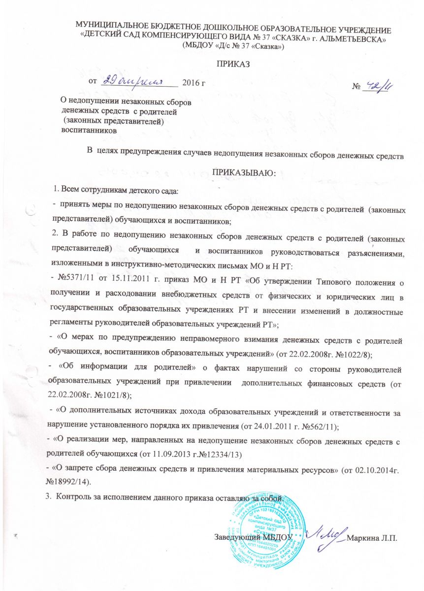 Приказ Управления образования «О недопущении незаконных сборов денежных средств»