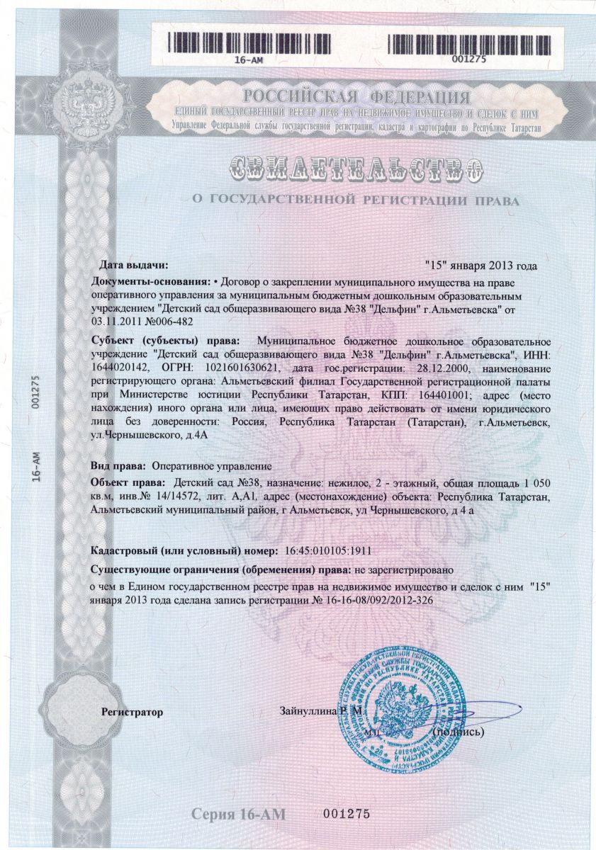Свидетельство о государственной регистрации права на недвижимое имущество МБДОУ №38