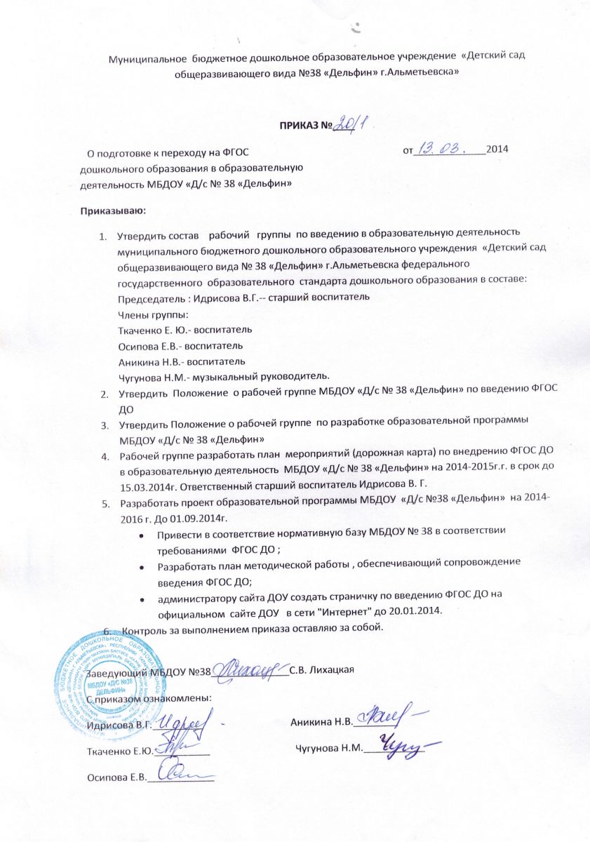 Приказ о подготовке к переходу на ФГОС ДО в образовательную деятельность МБДОУ №38