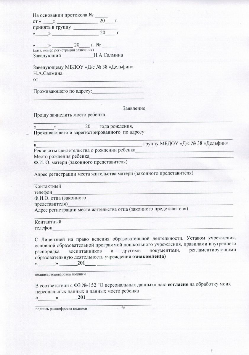 Образец заявления для поступления в ДОУ
