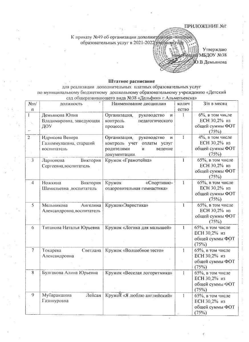 Штатное расписание для реализации дополнительных платных образовательных услуг на 2022-2023 учебный год