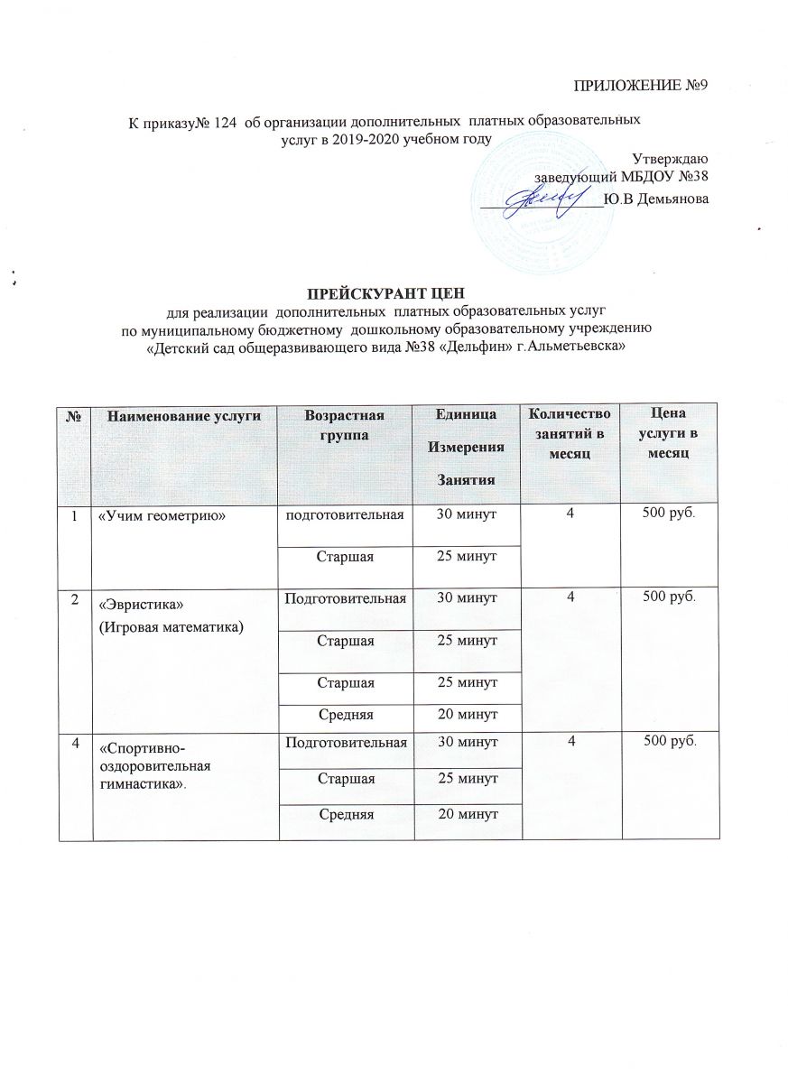 Прейскурант для реализации дополнительных платных образовательных услуг на 2019- 2020 учебный год