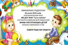 25 июля 2019 года в 17.00 в нашем детском саду пройдет родительское собрание для вновь поступающих детей.