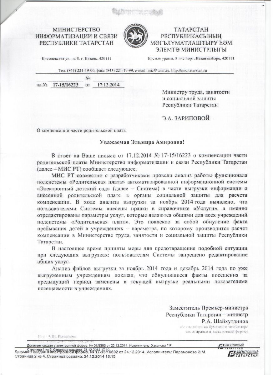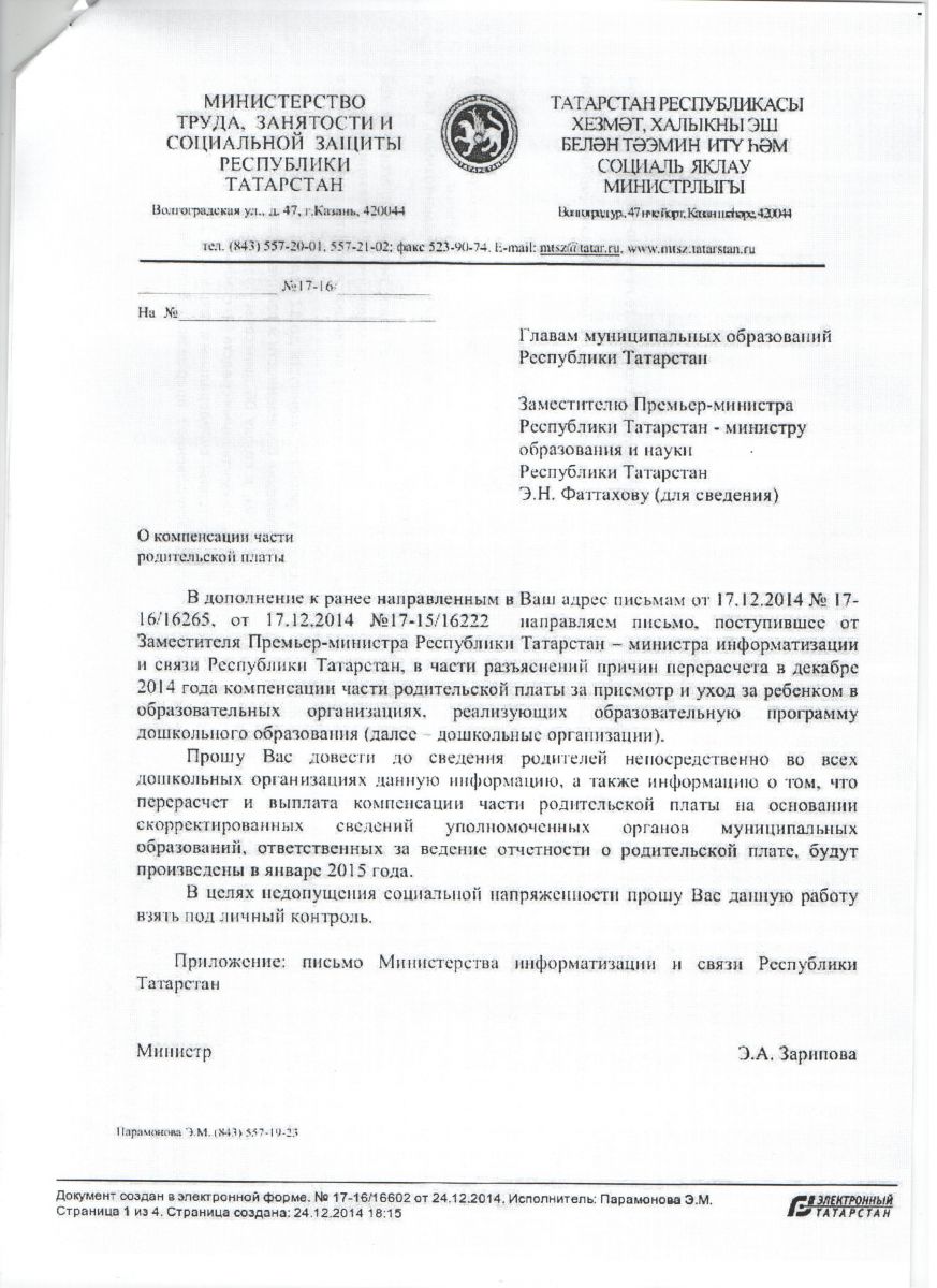 Письмо Министерства Образования РТ"О родительской плате за детский сад"