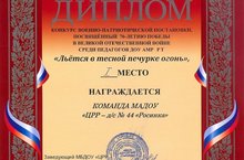 Поздравляем команду МАДОУ "ЦРР -д/с №44 "Росинка" занявших 1 место в конкурсе военно- патриотической постановки, посвященный 70-летию Победы в Великой Отечественной войне среди педагогов ДОУ АМР РТ "Льется в тесной печурке огонь".