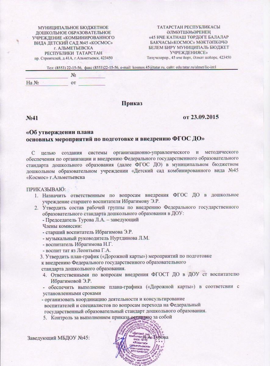 Приказ ДОУ об утверждении Плана мероприятий введения ФГОС ДО