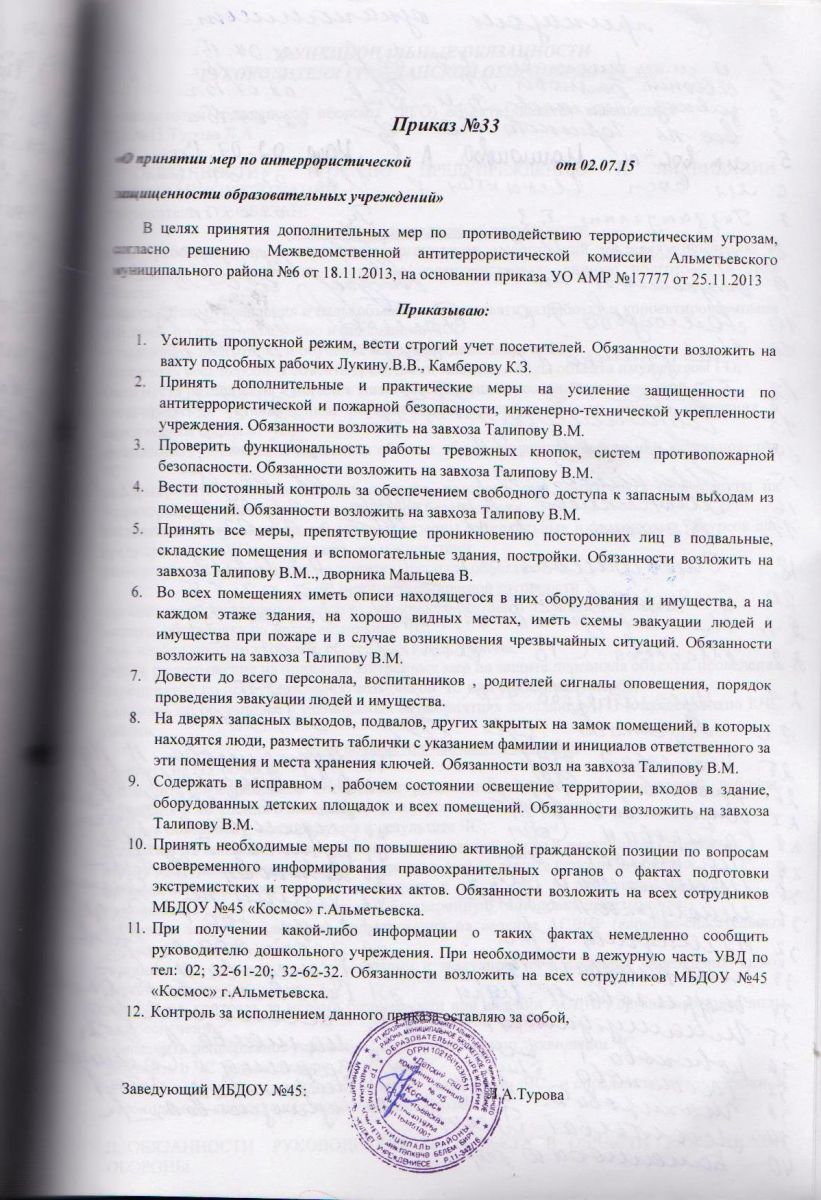 Приказ №33 "О принятии мер по антеррористической защищенности образовательных учреждений"