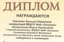12 ноября 2015 года в МБДОУ №22 "Алсу" состоялся муниципальный этап Республиканского конкурса "Я говорю и работаю по-татарски". Из 10 русскоязычных воспитателей дошкольных учреждений города, МБДОУ №46 "Золушка" на этом конкурсе представляла воспитатель старшей группы №6 Муленкова Юлия Геннадьевна. Достойно выступив, Юлия Геннадьевна заняла 3-е место. Коллектив детского сада от всей души поздравляет Юлию Геннадьевну с Победой в конкурсе!