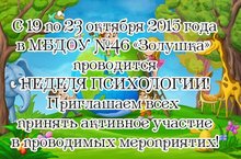 19 октября 2015 года стартовала Неделя психологии в МБДОУ №46 "Золушка". С педагогами ДОУ был проведен тренинг "Радость-когда тебя понимают", а также с детьми подготовительной к школе группы №10 проведена малая психологическая игра "Удивительное путешествие друзей в Зазеркалье".