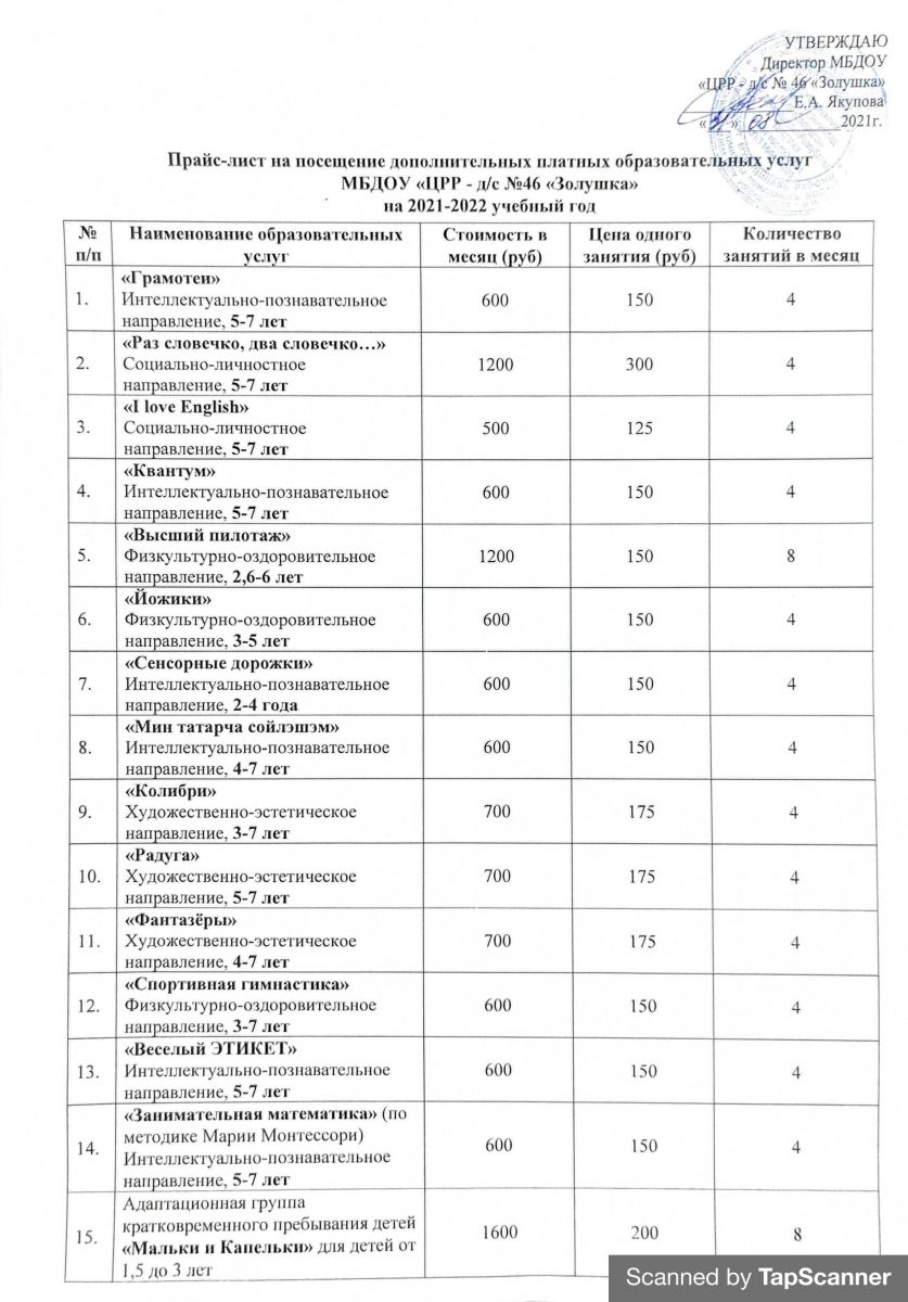 Перечень и стоимость доп.услуг 2021-2022