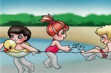 * Дети до 5 - 6 лет очень часто пребывают на пляже голенькими. Для того, чтобы Вы могли легко следить за своим ребенком, наденьте на берегу на него яркую панаму, девочке можно завязать волосы яркой резинкой или бантом. Когда ребенок плавает, надевайте на него легкоотличимые от других нарукавники или круг.