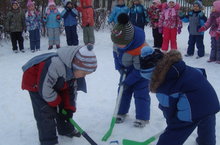 Дети средней группы с воспитателями Хазовой Г.С. и Хайбриевой М.Ш. с удовольствием играют в хоккей.