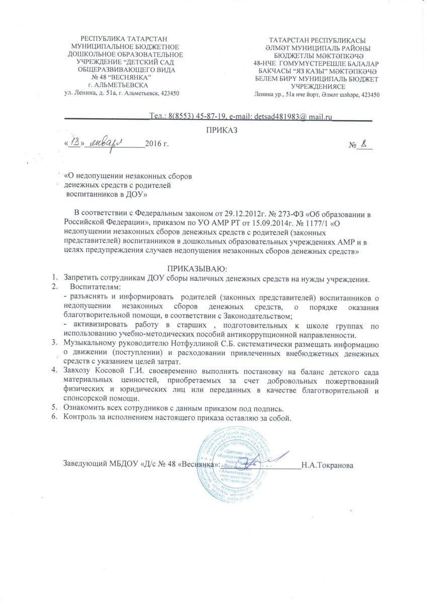 Приказ"О недопущении незаконных сборов денежных средства с родителей воспитанников в ДОУ.jpg