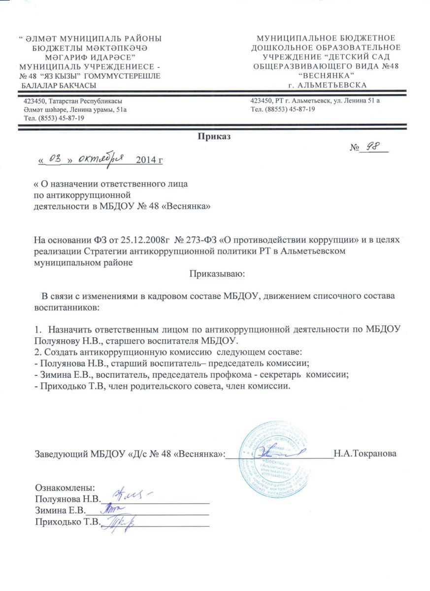 Положение об антикоррупционной политике деятельности МБДОУ "Д/с № 48 "Веснянка" г. Альметьевска