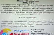 18 ноября 2022 года с 10.00 до 12.00 в рамках Всероссийского Дня правовой помощи детям, проводится мероприятие по правовому консультированию и просвещению по широкому кругу вопросов, касающихся защиты прав детей. ждем вас по адресу: гюАльметьевск, ул. К.Цеткин, д.54а, каб.103. Управление социальной защиты.
