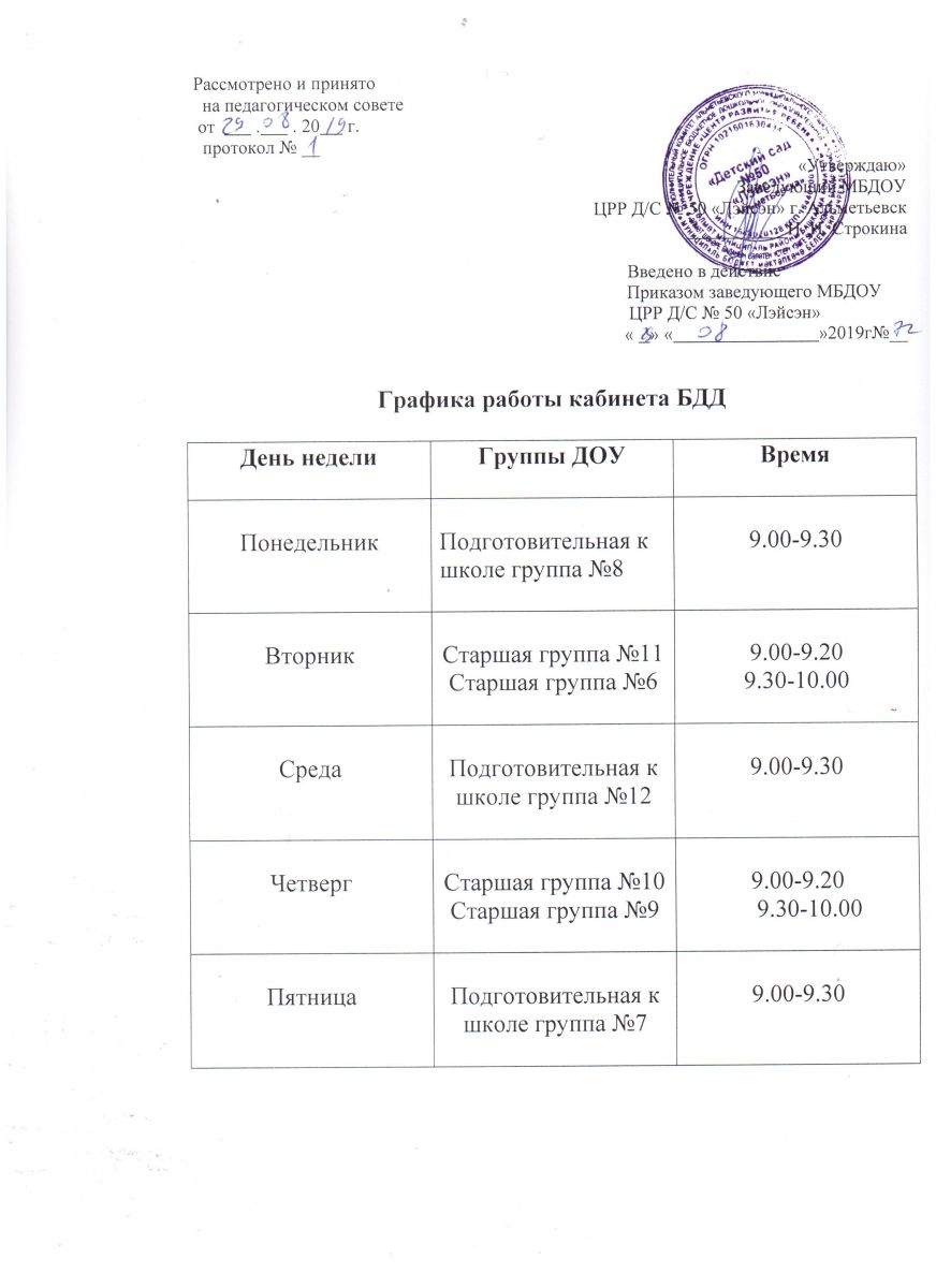 График работы кабинета БДД на 2019-2020 учебный год