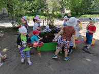 С приходом лета к обычному ассортименту детских игр присоединяются еще и всевозможные водные развлечения , забавы на свежем воздухе, и, конечно, игры в песочнице. В пользе «песочной терапии» уверенны педагоги группы №9, она помогает ребёнку развивать мелкую моторику , помогает регулировать механизмы мышления и открывает неограниченный простор для проявления фантазии. Игры с песком положительно влияют на развитие воображения и творческих способностей детей. Очень много чего можно вылепить из влажного песка: фигурные пирожки , тортики, домики, гаражи, города и др.Играя в песочнице с другими детьми, ребенок приобретает навык общения, социализируется. Учится ориентироваться в конфликтных вопросах, которые обязательно возникают в игровых ситуациях. Вырабатывается навык умения договариваться, уступать, делиться или наоборот отстаивать свои права. Все это пригодится в жизни подрастающему человечку.