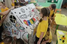 Ребята старшей группы №5 разрисовали домик "Совы". Целью данного коллективного занятия является умение детей создать композицию, подбирать и использовать разный материал для рисования (краски, восковые мелки, гуашь, цветные карандаши). Воспитывать у детей умение работать в коллективе.