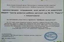 Наш детский сад принимал участие в проекте "Добрые крышечки" – это российский эколого-благотворительный волонтерский проект, имеющий двойную цель: сделать наш мир чище и помочь детям, которым нужна поддержка. Проект организован совместно Общественным движением "ДОБРЫЕ КРЫШЕЧКИ" и Благотворительным фондом «Волонтеры в помощь детям-сиротам». За активное участие в организации проекта наш детский сад был отмечен благодарственными письмами.