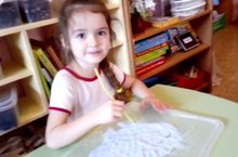 Игры с песком в группе № 8 - это просто, привычно, доступно и приятно! Ребёнок не боится рисовать на песке, потому что если он ошибется, то ошибку можно исправить. Причём делать это можно сколько угодно! Можно выдувать просто ямки и углубления на песке, а можно рисовать изучаемую букву, цифру и многое другое.