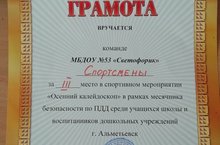17 октября 2019 г. воспитанники нашего детского сада приняли участие в городском спортивном мероприятии "Осенний калейдоскоп" в рамках месчника по ПДД среди учащихся школы и воспитанников дошкольных учреждений г. Альметьевска, заняли 3 место.