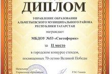 По результатам городского конкурса стендов, посвященного 70-летию Великой победы наш детский сад занял почетное 2 место. За активное участие в изготовлении и оформлении стенда, администрация ДОУ выражает благодарность Ефимовой Е.А., Мубаракшиной Э.Р.