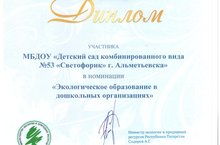 МБДОУ № 53 "СВЕТОФОРИК" принял участие в Республиканском конкурсе "Эколидер" и был удостоен Дипломом в номинации "Экологическое образование в дошкольных организациях" за подписью Министра экологии и природных ресурсов РТ - Сидорова А.Г.