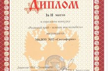 В рамках ежегодного муниципального конкурса "Эколидер" наш детский сад принял участие в конкурсе рисунков "Родимы край - зеленая моя колыбель". По результатам конкурса наш МБДОУ № 53 был награжден Дипломом за 2 место МБУ "Департамента экологии и природопользования" .
