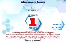 14 апреля 2015 года воспитанница МБДОУ № 53 «Светофорик» Маклова Анна приняла участие в четвертом Международном конкурсе, проходящем в формате фестиваля международных и всероссийских дистанционных конкурсов «Таланты России». За выполненную и представленную конкурсную работу в общей номинации «Вокал и музыка» Маклова Аннаприсудили за 1 место награждена дипломом в номинации «Эстрадная песня «Африка»».