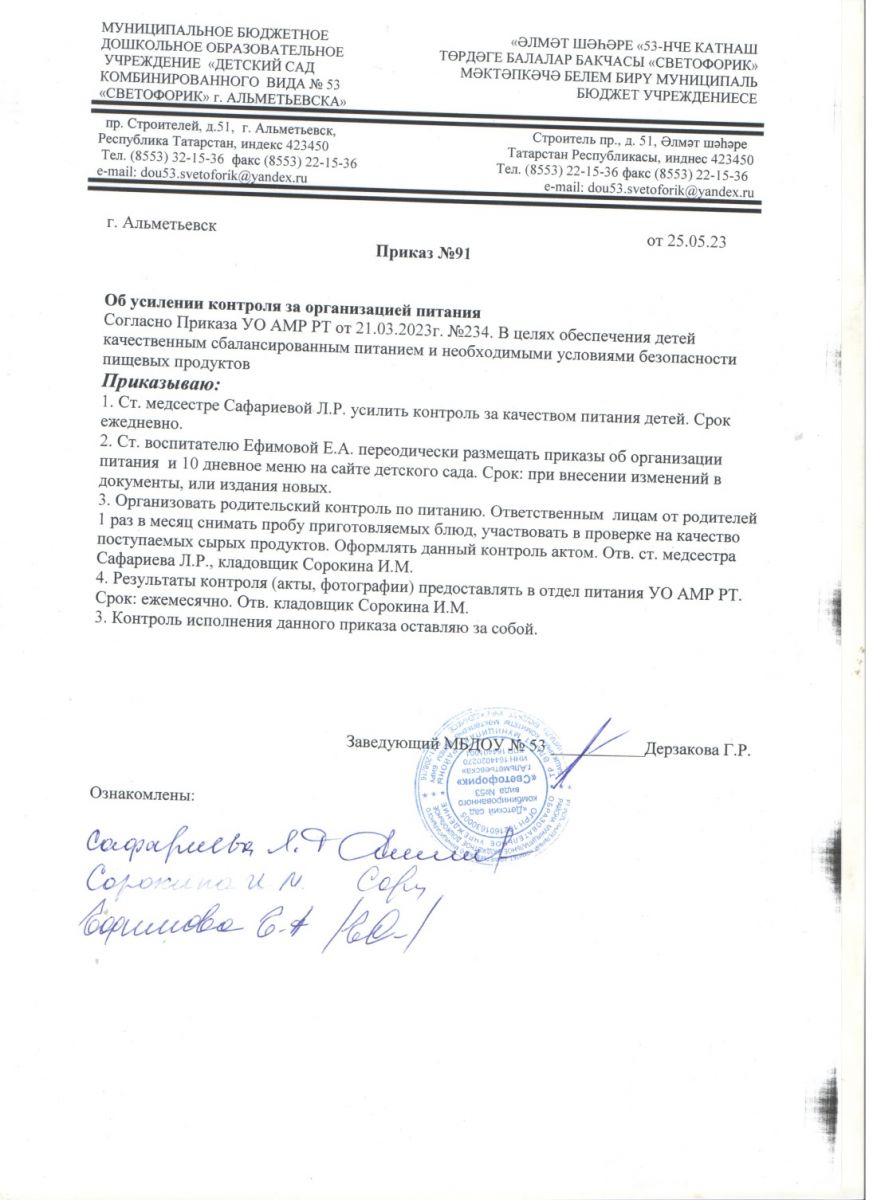 Приказ № 91 от 25.05.2023 г. "Об усилении контроля за организацией питания"