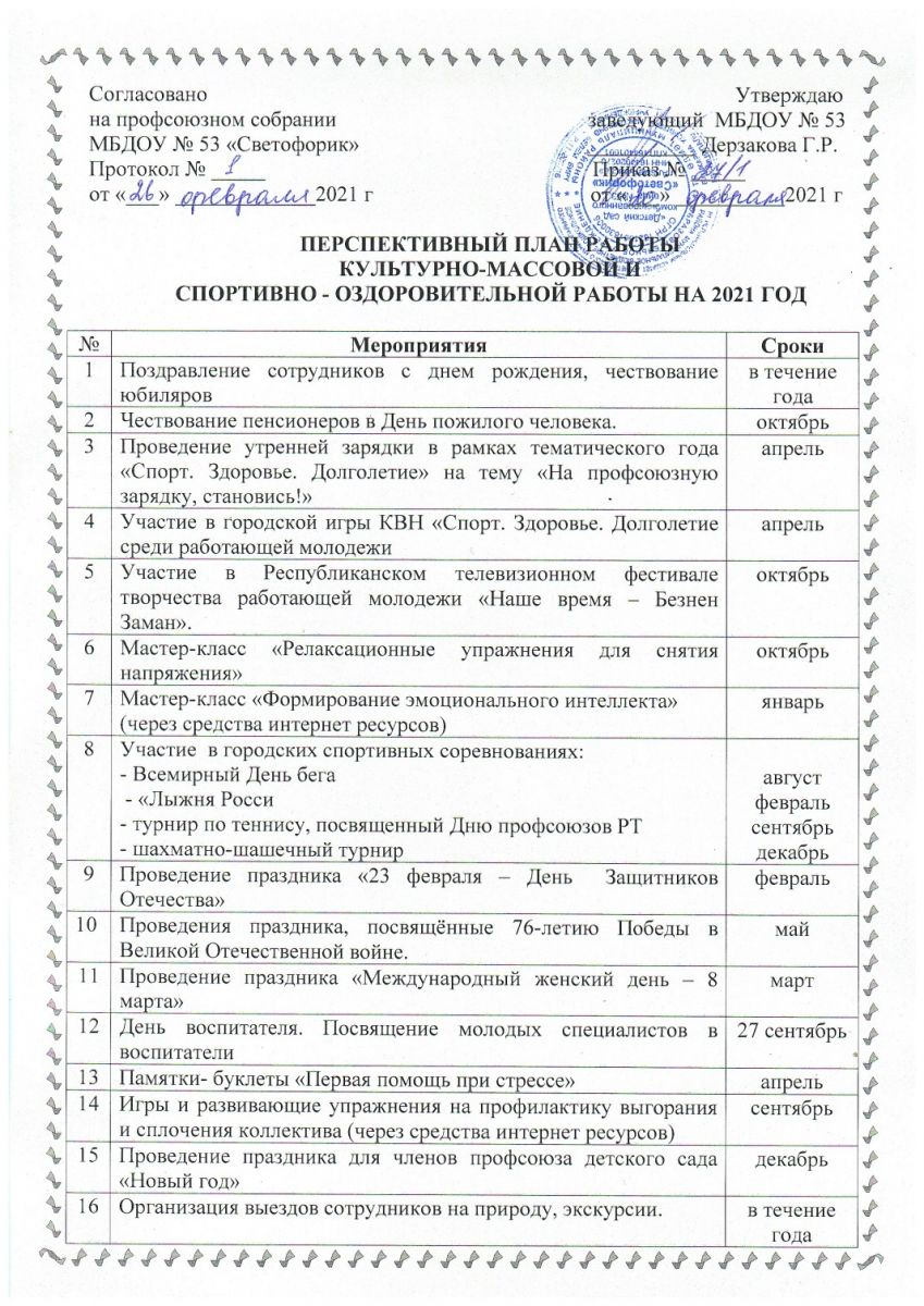Перспективный план культурно-массовой и спортивно-оздоровительной работы на 2021 год
