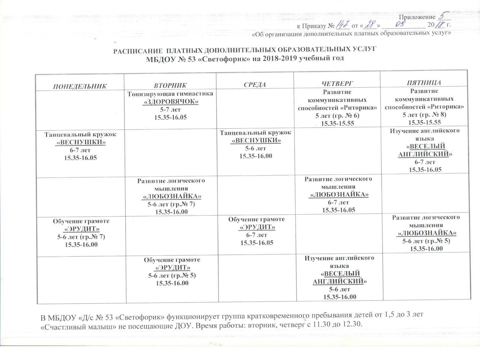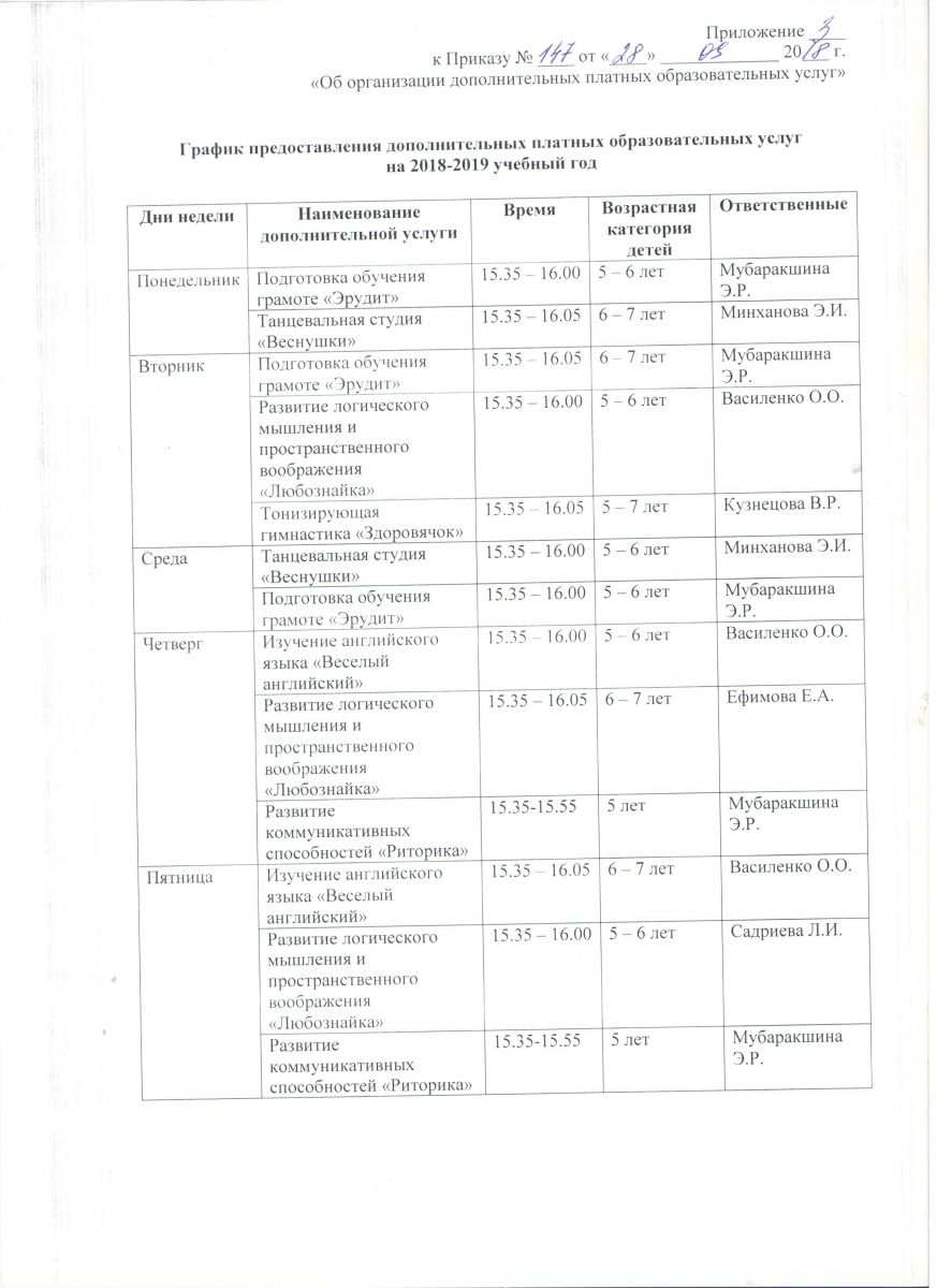 Расписание на оказание допуслуг на 2018-2019 учебный год