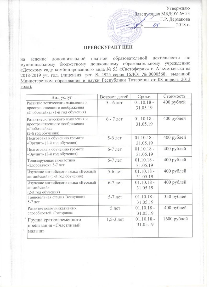 Прейскурант цен на 2018-2019 уч.год