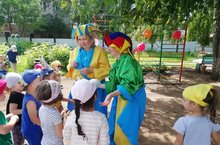 4 июля в детском саду прошло развлечение для детей "В гости клоуны пришли". Клоун Тяп (воспитатель Остапчук Н.В.) и клоун Ляп (воспитатель Музафарова Л.А.) доставили детям массу улыбок и удовольствия. Они смешили, играли с детьми, пускали мыльные пузыри, которые с большим задором ловили дети. Развлечение удалось на славу!