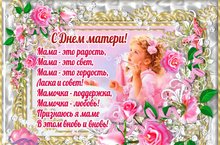 Поздравляем с днем Матери женщин!День осенний не грустен совсем.В мире есть непреложные вещи.Семьи нас сберегут от проблем.Мы хотим пожелать больше счастья,Пусть рассвет озаряет всегдаТой мечтой, что должна исполнятьсяИ не будут напрасны года!