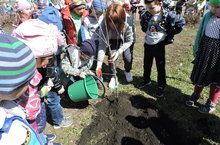 В рамках городской акции «Цветущий Альметьевск» в МБДОУ № 56 «Крепыш» была организована посадка яблонь. Деревья посадили совместно с воспитанниками данного учреждения. Всем процессом посадки деревьев руководила заведующий ДОУ. Она вручила саженцы детям старших возрастных групп. А дети, совместно с воспитателями, с удовольствием помогали посадке яблонь и обещали ухаживать за ними в течении всего периода воспитания в детском саду. Воспитанники младших групп помогли полить новые деревья. После работы дети спели «Каравай» молодым яблонькам. -