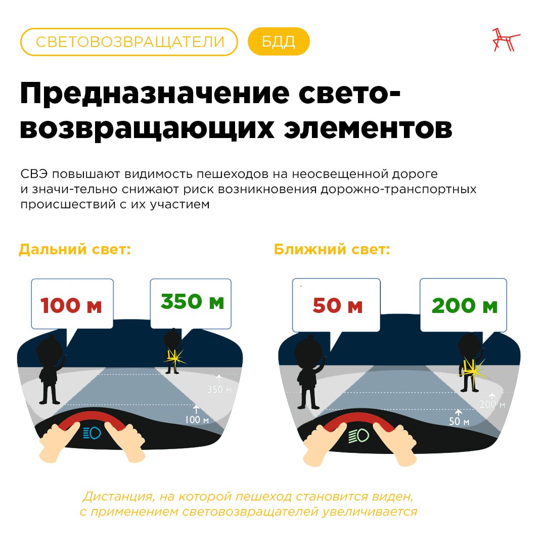 Приближается время года, когда на улице темнеет чуть раньше и видимость на дорогах может снижаться из-за дождя и снега. Поэтому очень важно сделать ребёнка более заметным на слабоосвещённых улицах и в тёмное время суток. Сделать ребёнка заметным помогут световозвращающие элементы. По статистике наезд на пешехода — один из самых распространенных видов ДТП, а использование световозвращателей снижает риск наезда на пешехода на 65—80 %.