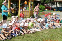 Дети делали зарядку, ездили на паровозике , играли в спортивные игры «Передай мяч», «С кочки на кочку», «Попади в цель», «Водяные игры»; дети второй младшей группы показали танец «У меня , у тебя».В конце все пели песнь про лето. Детям было очень весело и интересно принимать участие в празднике .