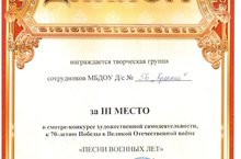 7 апреля на базе МБДОУ "Детского сада общеразвивающего вида №58 "Шаян нәниләр" г. Альметьевска состоялся смотр- конкурс инсценированной песни "ПЕСНИ ВОЕННЫХ ЛЕТ" среди сотрудников дошкольных образовательных учереждений Альметьевского муниципального района, где участвовала наша творческая группа "ЛЮБАВА" нашего детского сада и заняли III место поздравляем !!!