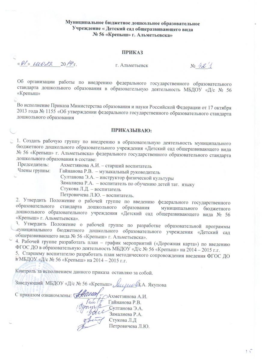 Приказ МИНИСТЕРСТВО ОБРАЗОВАНИЯ И НАУКИ РТ № 2295/14 от 23.04.14 г. " О внедрении ФГОС ДО"