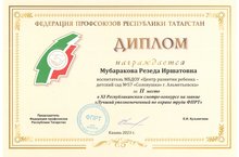26 мая в санатории "Жемчужина" г. Набережные Челны прошел XI республиканский конкурс Федерации Профсоюзов Республики Татарстан "Лучший уполномоченный по охране труда - 2023", на котором уполномоченный по охране труда МБДОУ “ЦРР - д/с № 57 "Соловушка" г. Альметьевск Мубаракова Резеда Иршатовна заняла второе место среди уполномоченных по охране труда бюджетных организаций РТ.
