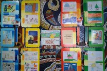 В холле детского сада оформлена передвижная выставка рисунков воспитанников детского сада и учащихся МБОУ «СОШ №2» «Туган җирем - Әлмәтем».